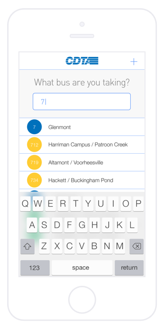 Once the user focuses in on the text field it is animated to the top of the screen, the background solidified and a list of all CDTA routes filled in.