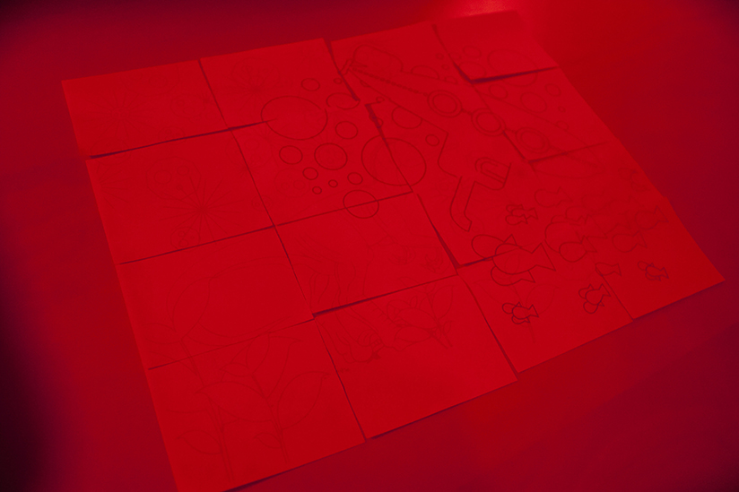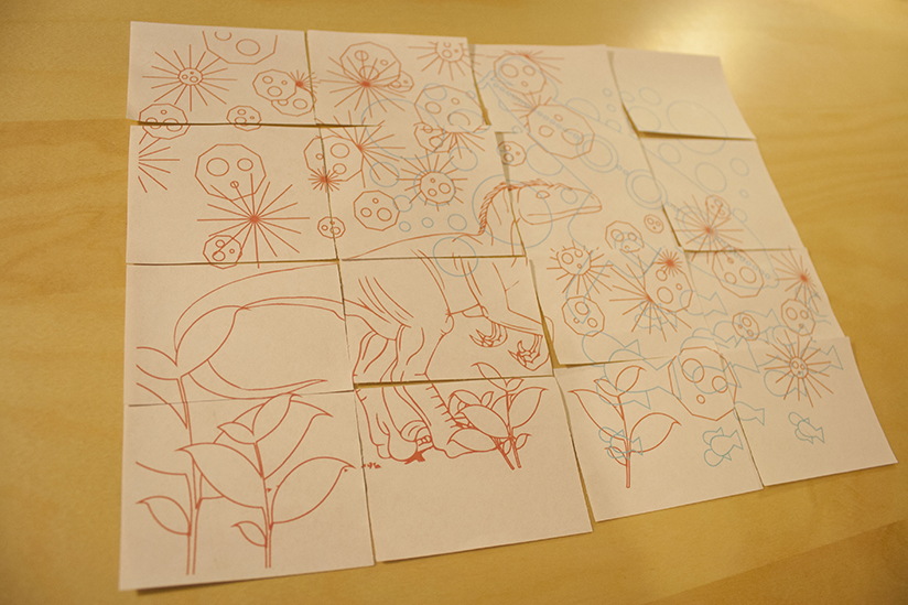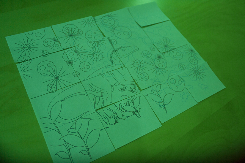 We developed a puzzle that had two unrelated images that overlapped — one printed in red and the other in cyan. We took two students and gave one red tinted glasses and the other cyan tinted glasses, so that each student could only see one of the images, and then had them work together to put the pieces together. We specifically overlapped the images so that parts would be difficult to solve by just one person.