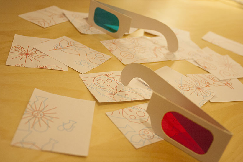 We developed puzzle with two unrelated images that overlapped — one printed in red and the other in cyan. We asked two students, one with red tinted glasses and another with cyan tinted glasses to work together to put the pieces together.